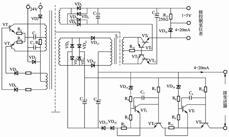 由于信號電流是單方向的,因此解調問題很簡單,只要對電流互感器T2的次級電流進行全波整流即可。為了產生恒流輸出,這里用共基極電路作整流放大。考慮到共基極放大電路中晶體管的β愈大,輸入電流(發射極電流)與輸出電流(集電極電流)之比愈接近于1,故在解調放大電路中用VT7、VT8和VT9、VT10組成復合管,以增大等效β值,提高工作精度。圖5中,電流互感器T2的次級方波電流作為復合管的輸入電流,經共基極放大電路后,產生的兩個半波恒流輸出,相加后,就得到與原來信號電流相等的4-20mA直流電流。此電流可直接供給控制室儀表,也可經電阻R13(250Ω)轉化為1-5V的電壓輸出。齊納二極管 VD19是電流輸出端的續流二極管,其擊穿電壓為6-7V。當電流輸出端上接有正常負載時它不工作,一旦外接負載電路切除,VD19便自動接入,保證輸出回路繼續連通。