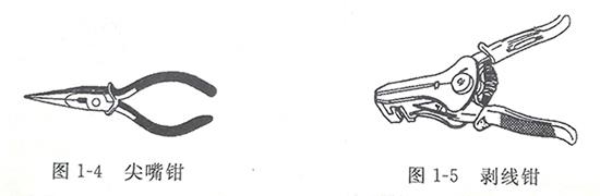 尖嘴鉗的頭部尖細,適用于在狹小的空間操作。刀口用于剪斷細小的導(dǎo)線、金屬絲等,鉗頭用于夾持較小的螺釘、墊圈、導(dǎo)線和將導(dǎo)線端頭彎曲成所需形狀。其外形如圖1-4所示。其規(guī)格按全長分為130mm、160mm、180mm和200mm四種。電工用尖嘴鉗手柄套有耐壓500V的絕緣套。