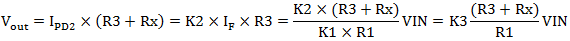 副邊的光敏二極管在發光二極管的照射下產生一個微小的電流IPD2,電流通過放大器的反饋電阻輸出電壓Vout。為了保證輸入U和輸出Uout相等,通過數字電位計對放大器U3的反饋電阻進行調整,數字電位計的阻值為Rx。定義 K1=IPD1/IF,K2=IPD2/IF。