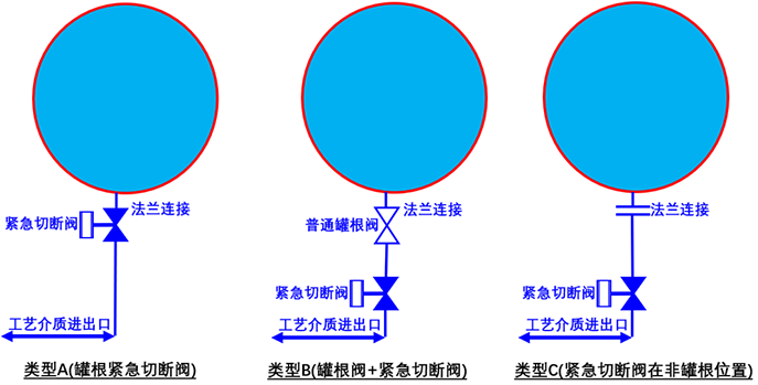 其次,既然在儲罐本體上新開注水口不太現實,那么采用已有的管線也就成了在役球罐注水改造的現實選擇。這個現實選擇很多企業是不盡相同的,因為每家企業的球罐工藝進出口管道是不太一樣的,這里面影響最大的一個區別就是球罐進出口管道上罐根閥和緊急切斷閥的布置問題。根據布置狀況的不同,我把在役裝置的球罐按照工藝管道進出口閥門的不同配置,按圖分為A、B、C三種類型,如下圖: