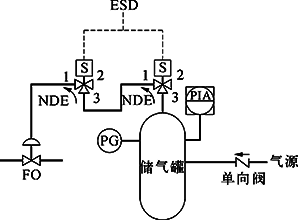 開雙電磁閥配置中,兩路信號電纜宜采用獨立路徑敷設(shè)。得電聯(lián)鎖配置中,聯(lián)鎖控制系統(tǒng)對信號電纜宜設(shè)置“Line Monitoring”,及時監(jiān)測到信號電纜斷線故障,并提示維護人員及時維修,一定程度上降低了因信號電纜斷線而不能執(zhí)行聯(lián)鎖的可能性。儲氣罐配置中,宜設(shè)置遠傳壓力指示報警。切斷閥宜采用彈簧復(fù)位型。雙電磁閥配置如圖4~9所示。