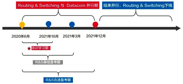 為了讓切換更加平滑,兩個認證會并行存在一段時間,預計到2021年底結束并行期,Datacom認證將取代Routing & Switching認證成為華為構建數通人才能力的標準,Routing & Switching將退出歷史舞臺。