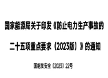 國家能源局關于印發《防止電力生產事故的二十五項重點要求(2023版)》的通知-國能發安全[2023]22號各省(自治區、直轄市)能源局,有關省(自治區、直轄市)及新疆生產建設兵團發展改革委,北京市城市管理委,各派出機構,全國電力安委會企業成員單位,各有關單位:為切實做好電力安…