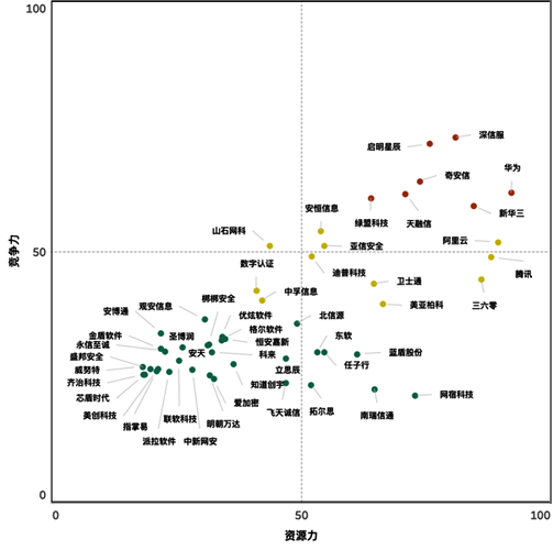 如上圖所示,“2020年CCIA中國網絡安全競爭力50強”從競爭力和資源力的維度,可以劃分為5個區域:產業領導者、互聯網巨頭、挑戰者、IPO準備區和創新者。