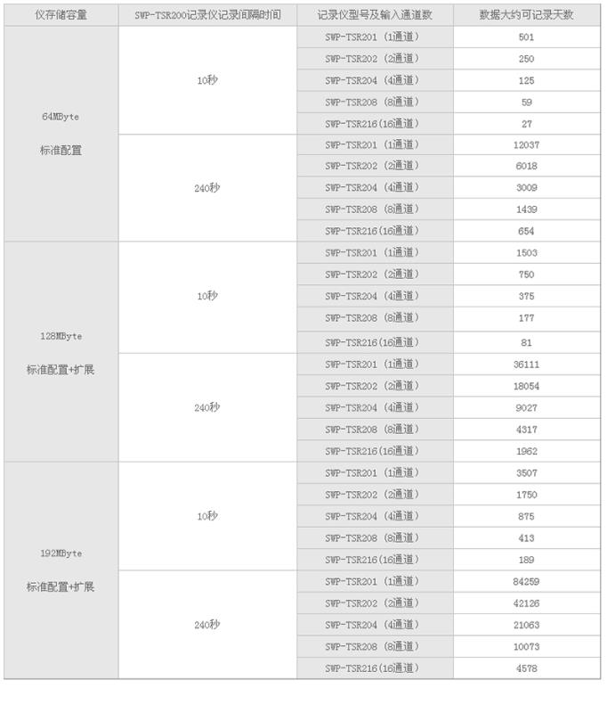 SWP-TSR100彩色無紙記錄儀數(shù)據(jù)記錄時間與儀表通道數(shù)量、無紙記錄儀記錄間隔時間和存儲空間有關系。可參看下表:
