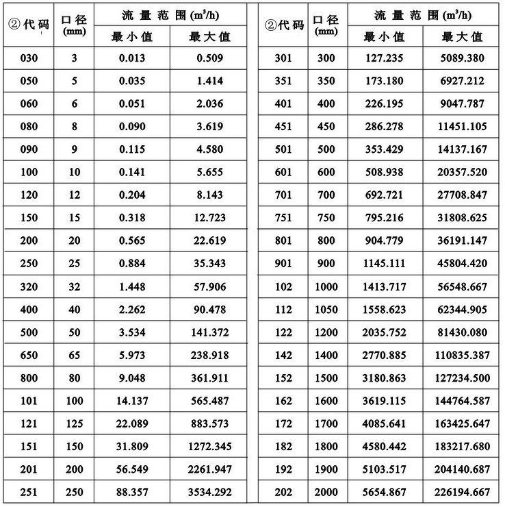 3、最大流量和最小流量,必須符合流量計測量范圍(參看選型表中口徑選型代碼表)