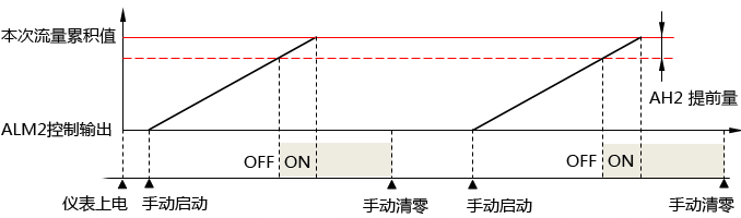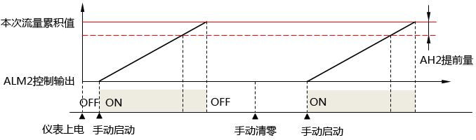 2、流量定量控制儀的第二報(bào)警(AL2)定量控制輸出時(shí)序圖