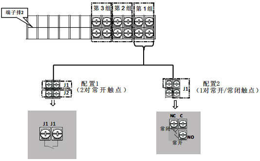 注:繼電器端子可分成3組,每組有兩種配置選擇(2對常開觸點或1對常開/常閉觸點)。