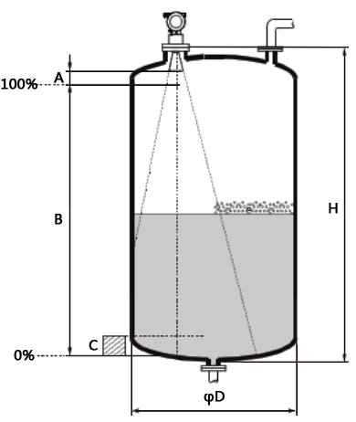 ◆測(cè)量范圍從波束觸及罐底處開始。特別是當(dāng)儲(chǔ)罐為圓盤底罐或罐體采用圓錐形排泄口時(shí),物位低于此點(diǎn)便無(wú)法進(jìn)行測(cè)量。