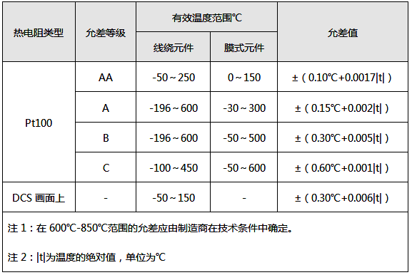 ①在有效溫度范圍內(nèi),Pt100的電阻值通過分度表查算出的溫度t與真實溫度的最大偏差,應(yīng)不超過上表給定的允差值。