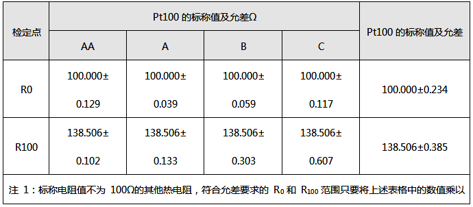 ②Pt100(0℃時電阻值為100的鉑電阻)標(biāo)稱值及符合允差要求的R0和R100范圍見下表。