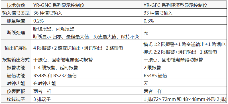 注1:YR-GFC經(jīng)濟(jì)型顯示控制儀不提供“通訊+變送輸出”功能,如果需要通訊等增強(qiáng)功能需要選擇YR-GNC系列顯示控制儀。切記!