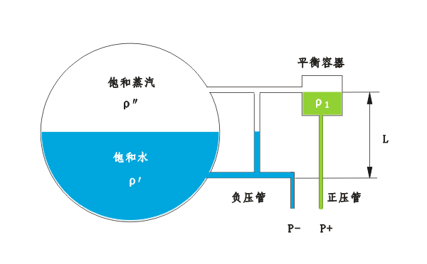 公式中,H為汽包水位高度;ρ1為平衡容器中水的密度;ρ′為汽包飽和水密度、ρ″為汽包內(nèi)飽和蒸汽的密度;L為汽包上、下連通管間距離。由公式可知,平衡容器結(jié)構(gòu)確定后(即L為已知常數(shù)),在汽包壓力維持恒定(ρ′、ρ″確定)以及ρ1一定的條件下,正、負(fù)導(dǎo)壓管的差壓輸出△P與汽包水位H呈單值函數(shù)關(guān)系。因此,若P+、P-接差壓變送器,就可根據(jù)所測(cè)出的差壓數(shù)值知道相應(yīng)的液位值。