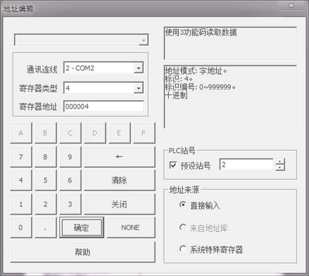 根據上面設置的串口,選擇COM2,寄存器類型選擇4,使用的是MODBUS中的03讀取指令。寄存器地址選擇4(000004是顯示格式,值就是4),和下表的儀表讀取一致。