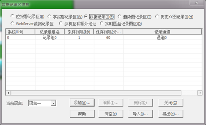 選擇SWP-HMI人機界面菜單上的“設置”----“數據記錄區”,打開如圖: