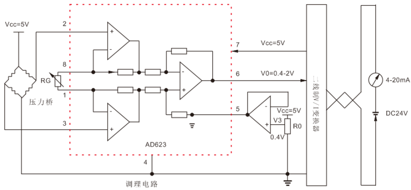 壓力橋、稱重傳感器輸出信號微弱,都屬于mV級信號。這一類小信號一般都要求用差動放大器對其進行第一級放大。一般選用低失調、低溫飄的差動放大器。另外在兩線制應用中,低功耗也是必需的。AD623是常用的低功耗精密差動放大器,常用在差分輸出前級的放大。 AD623失調最大200uV,溫飄1uV/度,在一般壓力變送應用保證了精度足夠。 R0將0.4V疊加在AD623的REF腳(5腳)上,在壓力=0情況下通過調整R0使輸出4mA,再調整RG輸出20.00mA,完成校準。電路設計時需注意,壓力橋傳感器相當于一個千歐級的電阻,耗電一般比較大。適當降低壓力橋的激勵電壓可以減小耗電電流。但是輸出幅度也隨之下降,需要提高AD623的增益。圖3給出的傳感器采用恒壓供電,實際應用中大部分半導體壓力傳感器需要恒流供電才能獲得較好的溫度特性,可以用一個運放構成恒流源為其提供激勵。