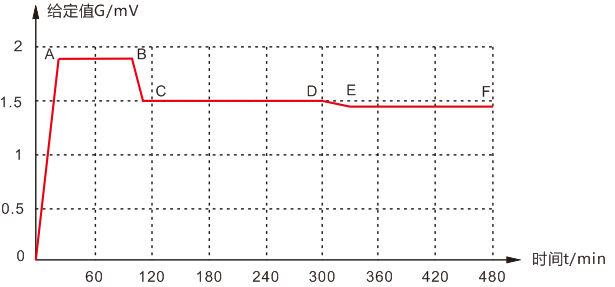②控溫:溫控器給定值置2.00mV,60段可編程溫控儀曲線見圖5,溫控器的實(shí)際給定值是2.00mV加上某一時刻程序給定儀之值。