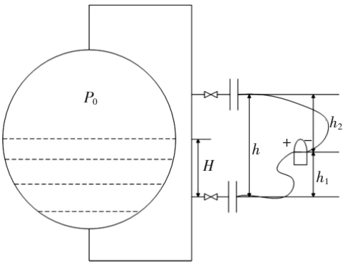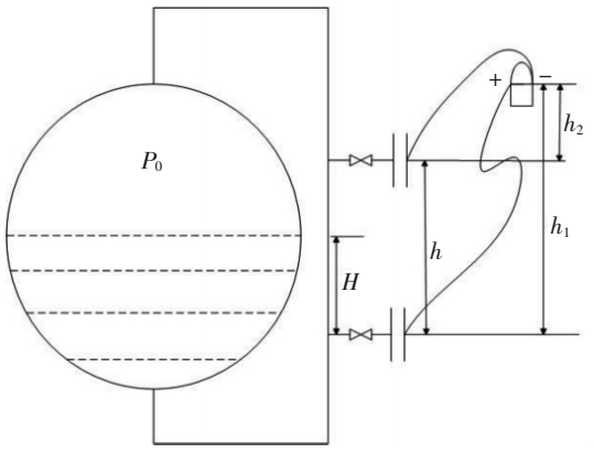 圖2中,H為高加內(nèi)的實(shí)際液位;h為高加內(nèi)的上部法蘭和下部法蘭之間的距離;h1為變送器負(fù)壓側(cè)和高加上部法蘭之間的高度;h2 為變送器正壓側(cè)和高加下部法蘭之間的高度;P0 為設(shè)計(jì)工況下高加內(nèi)的壓力;ρ水為設(shè)計(jì)工況下高加內(nèi)水的密度;ρ介為毛細(xì)管內(nèi)所充介質(zhì)的密度。