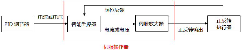 來(lái)自電動(dòng)執(zhí)行器外部的控制信號(hào)(控制信號(hào)為PID調(diào)節(jié)器或手操器的電流輸出)接入伺服放大器,再由伺服放大器將控制信號(hào)轉(zhuǎn)換為正轉(zhuǎn)/反轉(zhuǎn)開(kāi)關(guān)量輸出控制正反轉(zhuǎn)執(zhí)行器電機(jī)后輸出位移推力(直行程)或轉(zhuǎn)角力矩(角行程),驅(qū)動(dòng)閥門動(dòng)作。不難看出,伺服放大器是介于控制信號(hào)和執(zhí)行器電機(jī)之間的中間裝置,伺服放大器可獨(dú)立存在,也可以和執(zhí)行機(jī)構(gòu)集成在一起或?qū)⑹植倨髋c伺服放大器集成在一起。