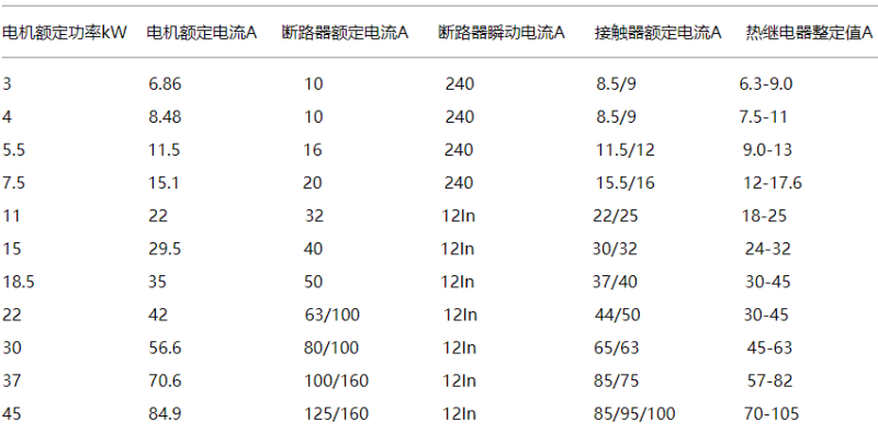 電機與配套的斷路器/接觸器/熱繼電器參數對照表