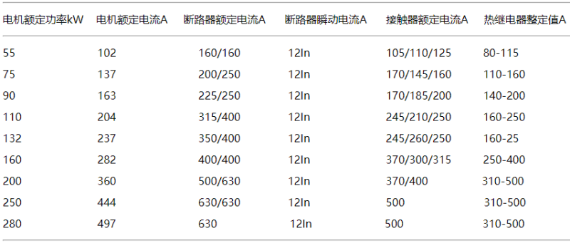 相對于頻繁啟動或線路過長的建議放大電流20%以確保接觸器安全使用,同樣斷路器合熱繼電器也放大20%電流。電動機小于5kW通常采用直接啟動,大于55kW采用星三角啟動或軟啟動。