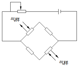 一般情況下,熱導氣體分析儀最適宜分析導熱系數相差甚大的二元混合物中某一組分。如果測量多種氣體混合物中某一組分時,則希望其余組分的導熱系數相同或十分接近,這樣可以將它們看做一個組分來對待,否則要在預處理系統中將干擾組分盡可能去除。熱導氣體分析儀檢測部分一般用惠斯頓電橋作為熱導傳感器也稱為熱導池,熱導原理如圖1所示。