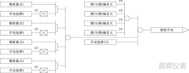 模擬量1與模擬量2、模擬量2與模擬量3、模擬量3與模擬量4、模擬量4與模擬量1值進(jìn)行偏差比較,偏差超過(guò)限值切除該調(diào)節(jié)系統(tǒng)自動(dòng)。