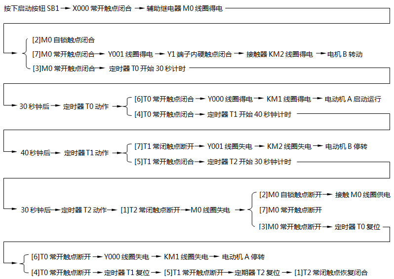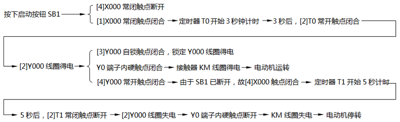 按下啟動按鈕SB1→[1]X001常開觸點閉合→[SET Y001]指令執(zhí)行→Y001線圈被置位,即Y001線圈得電→Y1端子內(nèi)部硬觸點閉合→接觸器KM線圈得電→KM主觸點閉合→電動機得電運轉(zhuǎn)。