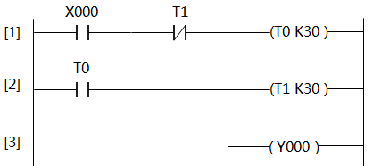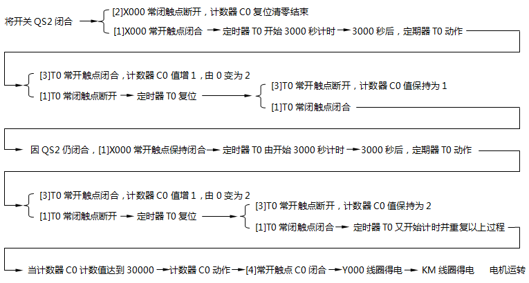 將開關(guān)QS閉合→X000常開觸點閉合→定時器T0開始3秒鐘計時→3秒鐘后,定時器T0動作,T0常開觸點閉合→定時器T1開始3秒鐘計時,同時Y000得電,Y0端子內(nèi)部硬觸點閉合,燈HL點亮→3鐘秒鐘后,定時器T1動作,T1常閉觸點斷開→定時器T0復(fù)位,T0常開觸點斷開→Y000線圈失電,同時定時器T1復(fù)位→Y000線圈失電使燈HL熄滅;定時器T1復(fù)位使T1閉合,由于開關(guān)QS仍處于閉合,X000常開觸點也處于閉合,定時器T0又重新開始3秒鐘計時。