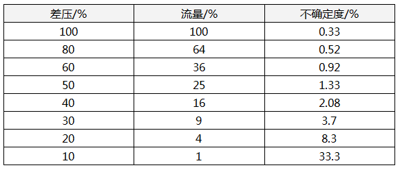 從計算可知在流量計三分之一量程時,差壓值僅是最大差壓的九分之一,這時差壓變送器已經很難反映出流量的變化了。如反映在流量計刻度及記錄紙上,則所測流量值越低,同一流量增量的分度線越密,幾乎難以分度。現以一臺差壓為60kPa 對應20000kg/h的流量計為例,假設該差壓變送器的綜合誤差為1.0%,按GB/T2624-2006標準中不確定度估算方法,來計算各流量時的不確定度(為便于理解和比較,表中全采用百分數),即:
