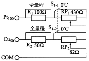 當將開關S1扳至“全量程”位置時,它把R1及R2電阻短接了,這時從Pt100端與COM端輸出的可調電阻值為10-430Ω,可滿足 Pt110熱電阻測溫范圍從-200~850℃時對應的電阻值;而從Cu50端與COM端輸出的可調電阻值為5-82歐姆,可滿足Cu50熱電阻測溫范圍為-50~150℃時對應的電阻值。