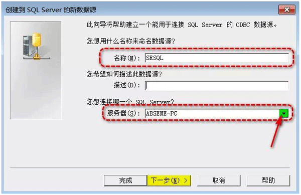 6、填寫數(shù)據(jù)源的名稱,可以任意填寫,本文為SESQL,點(diǎn)擊倒三角形按鈕,選擇SQL服務(wù)器,如果無(wú)法選擇,直接輸入SQL服務(wù)器名稱,為計(jì)算機(jī)名稱,本文為ABSEME-PC。