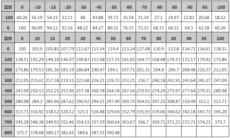 Pt100分度表是以表格形式提供各溫度和對應的電阻的,《Pt100分度表怎樣查看》介紹詳細查表的方法,不會的可以去看看。