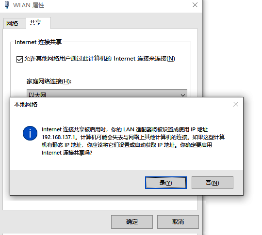 選擇完成后系統會提示你的有網卡會被重置IP地址為192.168.137.1/24,點擊是,確定即可。