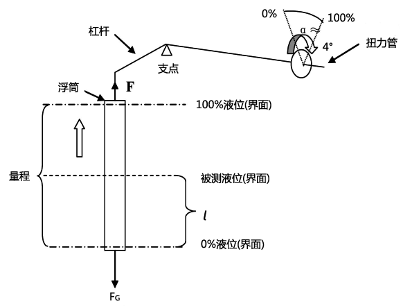 在量程0%處浮力:F0=FG,在量程100%處浮力:F100=FG-V×ρ×g;α為扭力管的轉角=液位在量程100%處的角度-液位在量程0%處的角度;FG為浮筒的重量;V為浮筒體積;L為全量程;l為液位的高度;ρ為液體比重;g為重力加速度;F為浮力=FG-V×ρ×g。