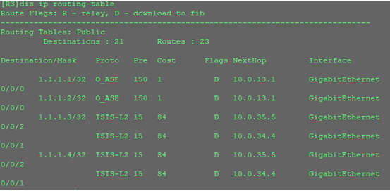 可以看到路由表中已經存在1.1.1.3/32和1.1.1.4/32的主機路由,說明路由引入成功。