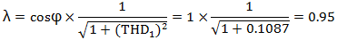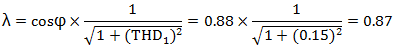 例1:某籠型電動機,cosφ為0.88,電流總諧波畸變率為15%,求λ值。