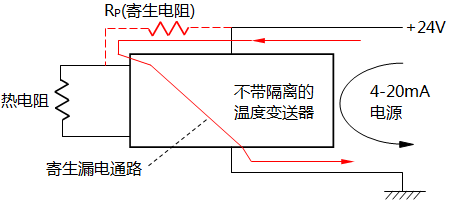 圖1 寄生漏電通路在不帶隔離的溫度變送器中的示意圖
