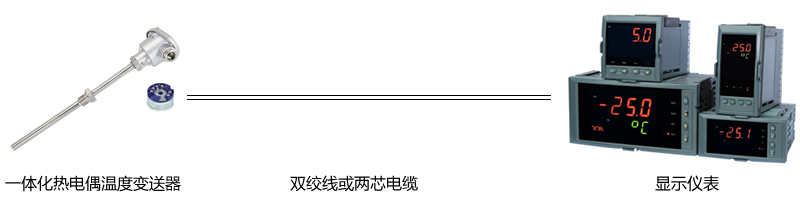①溫度變送器安裝在熱電偶接線盒內(nèi)構(gòu)成一體化熱電偶溫度變送器,熱電偶偶絲直接接到溫度變送器輸入端上,輸出為二線制4-20mA信號(hào),變送器與顯示儀表或DCS系統(tǒng)直接用雙絞線或兩芯屏蔽電纜連接,不使用熱電偶補(bǔ)償導(dǎo)線。