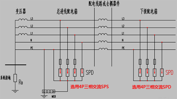 ①TN-C-S系統中總進線配電箱處裝設3P三相交流電源SPD(推薦型號為YR9000PB-40/320-3P),N線上不必裝設,下級配電箱處需裝設4P三相交流電源SPD(推薦型號為YR9000PB-40/320-4P);