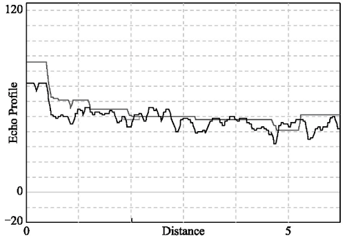 超聲波脈沖在容器內飛行傳輸過程中,遇到爬梯、梁、管道、焊縫、攪拌葉片等結構物時,也會產生回波,即雜波干擾信號。為了從回波曲線中甄別出真實的液位回波信號,超聲波液位計通常會設置一條隨時間變化(即空間上的距離變化)的濾波曲線,確定當回波信號超出閾值時,才被認定為有效回波,進而進入算法識別模塊后續處理。該回波抑制曲線,又稱為TVT時變閾值、干擾抑制曲線、罐體映像等,其目的在于通過閾值門限,濾除無用干擾雜波。如圖2所示。