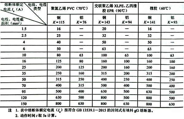 表1 按短路保護要求()不同電線、電纜類型及截面積時,熔斷體額定電流(In)最大允許值