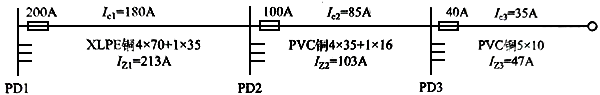 解:按照計算電流選擇的三段配電線路的類型和截面積,查表1可知,其短路保護的熔斷體額定電流(In)最大允許值分別為500、250、80A,比按過負荷保護要求選擇的熔斷體額定電流值200、100、40A(標注在圖1中)大得多,完全滿足短路保護要求。