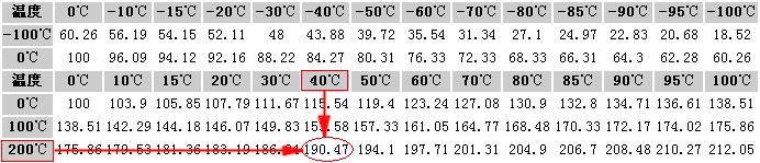 我們以查詢Pt100鉑電阻240℃時(shí)溫度值對(duì)應(yīng)的電阻值為例:基本方法與前面一致。首先在第一列上部找到200℃位置,再在列中找到40℃位置,兩個(gè)位置的和200+40=240℃,這兩個(gè)位置在表格中交叉點(diǎn)的數(shù)據(jù)為190.47歐姆,那表明溫度240℃對(duì)應(yīng)的電阻值為190.47歐姆,查表完成。