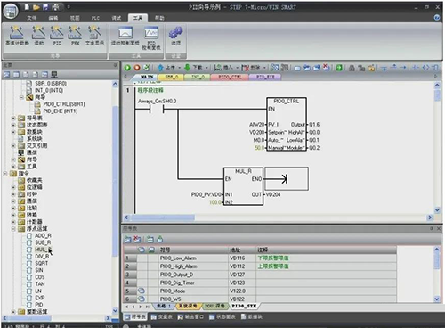 插入實數相乘指令,在IN1處輸入地址VD0,IN2處輸入100.0,OUT處輸入地址VD204,該指令把標準化的過程變量轉化成了實際溫度值存放在VD204中。對使用的地址進行符號定義,如下圖所示,這樣通過調用PID向導生成的子程序使溫度保持在給定值的程序就編寫完成了,最后,保存編譯項目。
