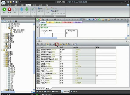 在工具菜單功能區單擊PID控制面板按鈕,打開PID整定控制面板對話框,選擇回路0,先啟動手動調節,輸入PID參數,如增益改為5.0,單擊更新CPU,使新輸入的參數值起作用,監視趨勢圖,根據調節狀況改變PID參數直至調節穩定,即過程值與設定值接近,且輸出沒有不規律的變化,并最好處于控制范圍中心附近,此時可將手動調節改為自動調節,即自整定。