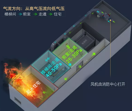 加壓送風作為一種行之有效的防煙方式,在國內外高層建筑設計中已被廣泛接受與采用。無論國內或國外的防火規范,都有一致的加壓要求,即應使在火災時,樓梯間余壓值(40-50Pa)>前室余壓值(25-30Pa)>走廊。