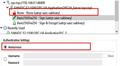 選中剛添加的Server,選中”None-None…”,選項,即無安全校驗。因PLC中默認啟用訪客認證,因此可以在Anonymous處,進行無密碼登錄。點擊OK…