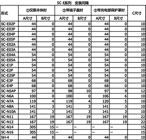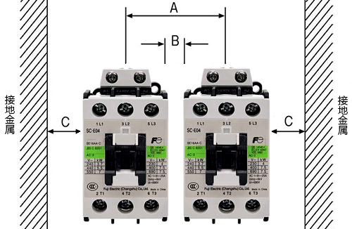 本文以富士產品為例,此時電磁接觸器的間隔可參看下表中的②、③列所示的最小距離值。