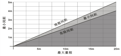 ④探頭的安裝應避免其發射的聲波通道與容器壁保持如圖四所示的理想區域內。圖四所示量程與探頭安裝距離容器壁的區域,如果安裝距離小于理想區域下線所規定的距,則應將探頭安裝在“最小間距”區域之內。如果距側壁的安裝距離仍“最小間距”線的下方,變送器將有可能不能正確地測量物位。見圖d。